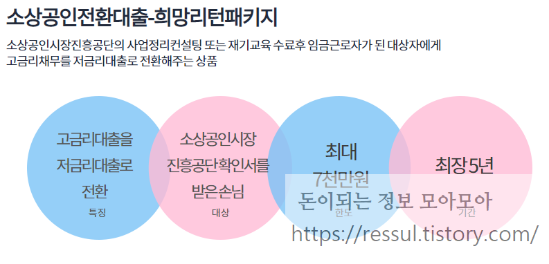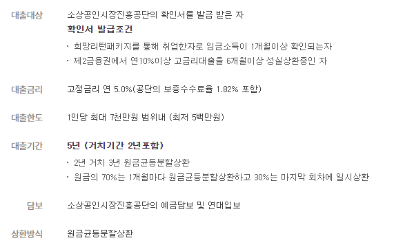 대출대상으로는 소상공인시장진흥공단의 확인서를 발급받아야 합니다. 이 확인서는 희망리턴패키지를 통해서 취업한 사람이어야 합니다.