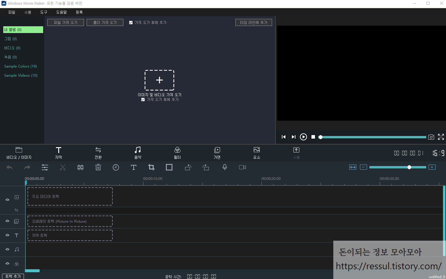 정상적으로 실행이 된다면 위와 같은 화면이 나오게 됩니다. 일반적인 동영상 편집프로그램과 유사한 화면입니다.