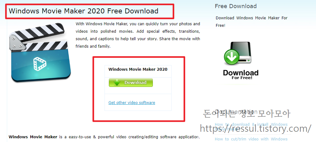 가운데 위치한 다운로드 버튼을 클릭해서 무비메이커를 다운로드 받아주면 됩니다. 구버전을 다운로드 받고 싶다면 아래 get other video software 버튼을 클릭해서 받아주면 됩니다.