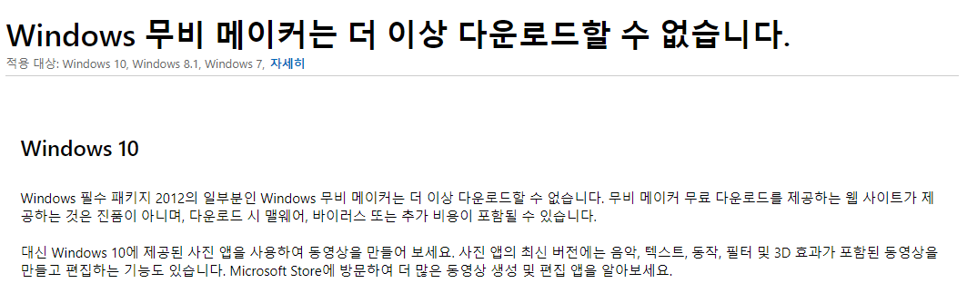 일단 공식적으로 무비메이커는 지원이 중단된 것으로 알고 있습니다. 해당 관련 내용은 마이크로소프트에서 공지를 했습니다.